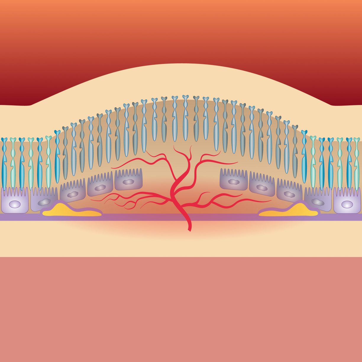 Im Unterschied dazu ist ein kleiner Teil der Patienten von der wesentlich aggressiveren „feuchten“ Form der Makuladegeneration betroffen: Das Pigmentepithel wird brüchig. Feine, neu gebildete Blutgefäße können es durchdringen. Diese Blutgefäße sind meist undicht.