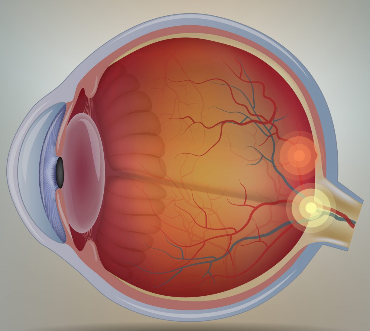 Die Netzhaut enthält Millionen lichtempfindlicher Zellen. Das Zentrum der Netzhaut ist die Makula (roter Kreis) oberhalb des Sehnerven (gelber Kreis). Auf diesem wenige Quadratmillimeter großen Fleck sind die lichtempfindlichen Zellen besonders dicht angesiedelt.